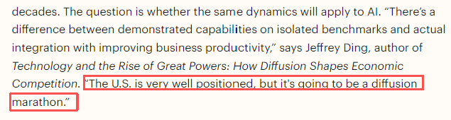 正如科技史著作《科技与大国崛起》的作者杰弗里·丁所言:“基准测试表现与实际生产力提升是两回事。尽管美国现在的位置不错,但是这是一场持久的马拉松。”