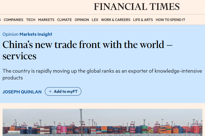 英国《金融时报》近日刊文指出,中国连续多年保持全球货物贸易第一大国地位,同时中国的服务出口近年来加速增长,知识密集型服务正成为中国外贸变化中的一个新现象。