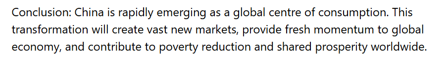 文章最后认为,中国正在加快成长为全球消费中心之一。这一转变有望催生新的市场空间,为全球经济注入新动力,并有助于在更大范围内推动减贫与共同繁荣。