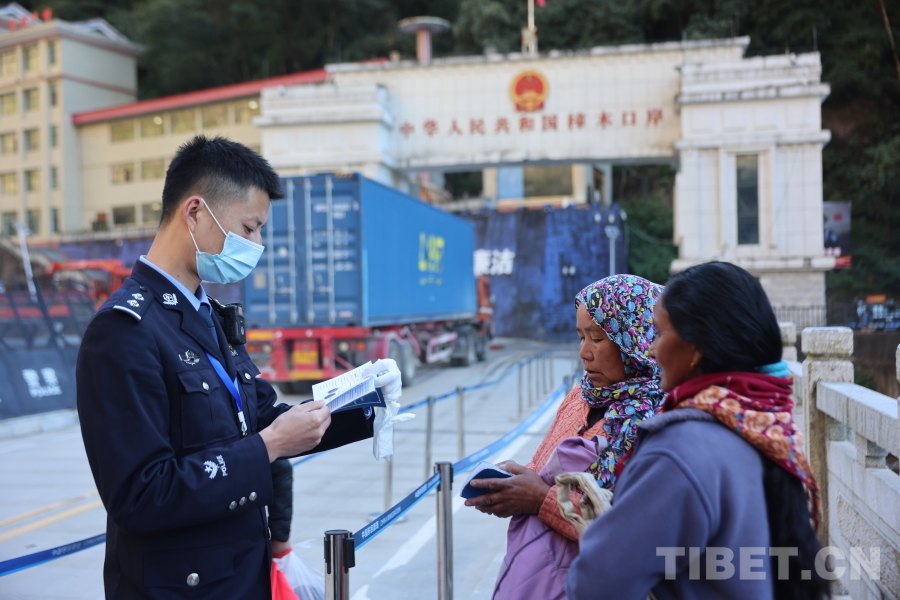 图为聂拉木边检站民警对出入境人员的证件进行抽检