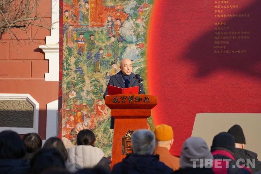 展览开幕式现场,文化和旅游部党组成员、故宫博物院院长王旭东,西藏自治区人民政府党组成员、副主席徐志涛,故宫博物院原院长郑欣淼,中国文物保护基金会理事长刘玉珠,中国佛教协会会长演觉,中国古迹遗址保护协会理事长宋新潮,国家民族事务委员会古籍整理研究室一级巡视员孙继为,故宫博物院党委书记、副院长都海江,文化和旅游部非物质文化遗产司二级巡视员张玲,西藏自治区人民政府办公厅二级巡视员旦巴央培,西藏自治区文化厅党组成员、西藏自治区文物局党组书记、副局长赵兴邦,全国政协委员、萨迦寺寺管会常务副主任洛卓加措,香港赛马会慈善事务部主管叶巧儿出席。文化和旅游部、国家文物局下属文博单位,西藏自治区人民政府下属相关单位,北京市人民政府下属相关单位,本次展览的独家捐助方公益慈善研究院,相关协会、学会、基金会,各参展单位,特邀相关业务合作单位等也现场出席。
