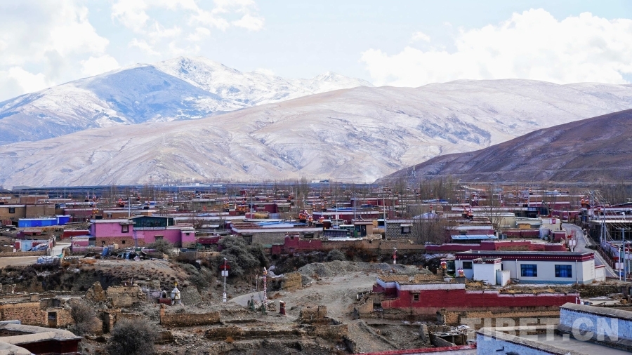曲松县居民家和文化遗址融为一体,与远处的雪山构成一幅美丽的图景。