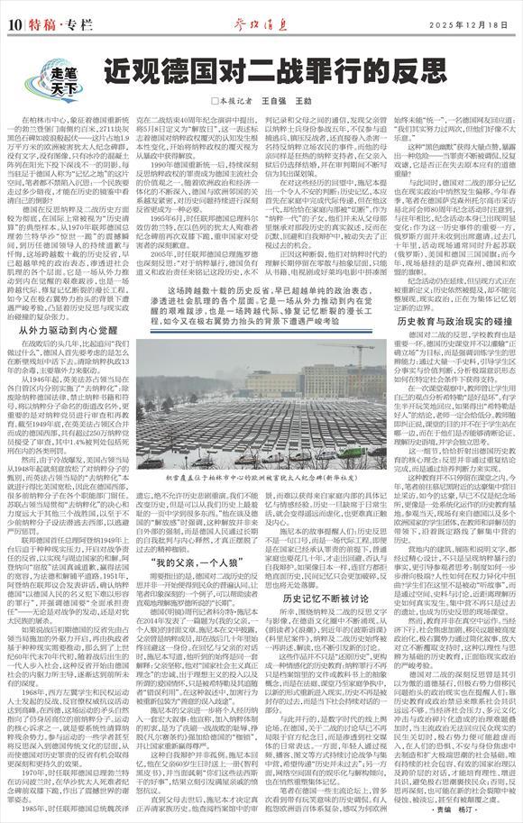 1990年德国重新统一后,持续深刻反思纳粹政权的罪责成为德国主流社会的价值观之一。随着欧洲政治和经济一体化的不断深入,德国与欧洲邻国的关系越发紧密,对历史问题持续进行深刻反省更成为一种必要。