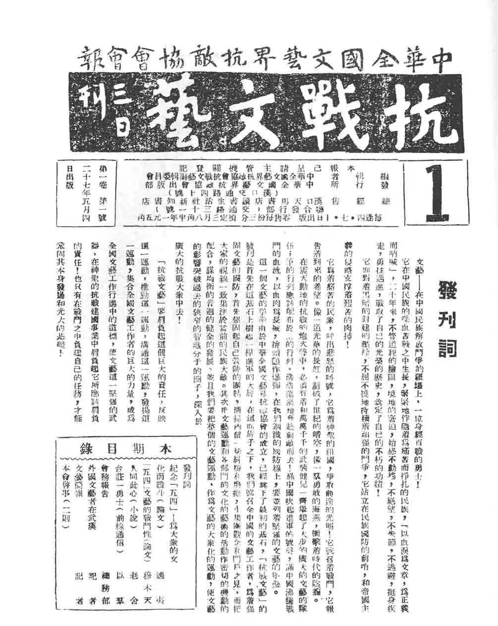 1938年3月,由老舍、郭沫若、郁达夫等作家及冯玉祥、邵力子等知名人士筹备的中华全国文艺界抗敌协会(简称“文协”),在武汉汉口总商会礼堂宣告成立,号召“我们应该把分散的各个战友的力量,团结起来,像前线将士用他们的枪一样,用我们的笔,来发动民众,捍卫祖国,粉碎寇敌,争取胜利。”随后,其会刊《抗战文艺》发刊,承载着爱国文艺工作者挽救中华民族、抗战到底的决心,成为贯通整个抗战时期的核心文艺阵地,汇聚文艺力量的精神堡垒。