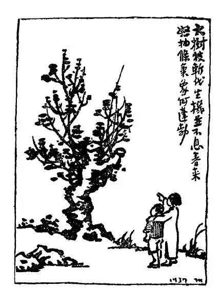 图为丰子恺多次在画作中将中国比作大树,其中一件题诗:“大树被斩伐,生机并不息。春来怒抽枝,气象何蓬勃!” 图片来源:北京日报