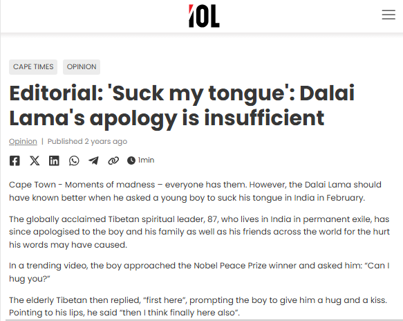 要求印度男孩“吸我的舌头”。“美国国家公共电台”2023年报道称,当年2月达赖在一场公开活动中拥抱了一名印度男孩,并要求他“吸我的舌头”,男孩慢慢把头靠近达赖,但似乎只是碰了一下达赖的额头就缩了回去。南非《水星报》报道称,十四世达赖作为精神领袖,比任何人都懂得道歉和宽恕,但道歉并不能免除他为自己的行为承担后果。十四世达赖对无辜男孩做出的反常行为,已经证明了他只不过是一个变态的、“堕落”的人。