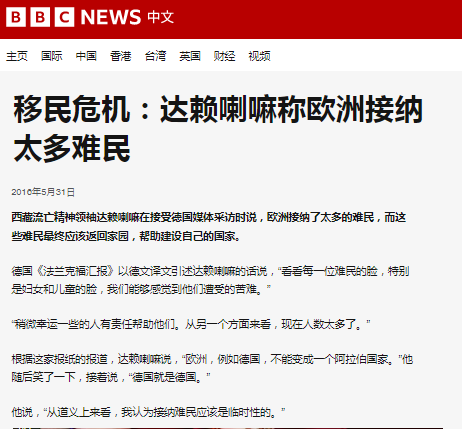 笑称“德国不能变成阿拉伯国家”。“英国广播公司”2016年报道称,德国《法兰克福汇报》报道以德文译文引述达赖的话称,欧洲已接纳了“太多”难民,欧洲,比如德国,不能变成一个阿拉伯国家。他随后笑了一下接着说:“德国就是德国。从道义上来看,我认为接纳难民应该是临时性的。”英国《独立报》发文称,在很多人眼中,达赖是慈悲的化身,但他却公然反对欧洲难民政策,认为接纳阿拉伯地区难民就会成为“阿拉伯国家”,这种观点是危险的。英国人想将难民赶出英国以保持所谓英国性,但这本身就会危及民族身份,会导致社会孤立主义。