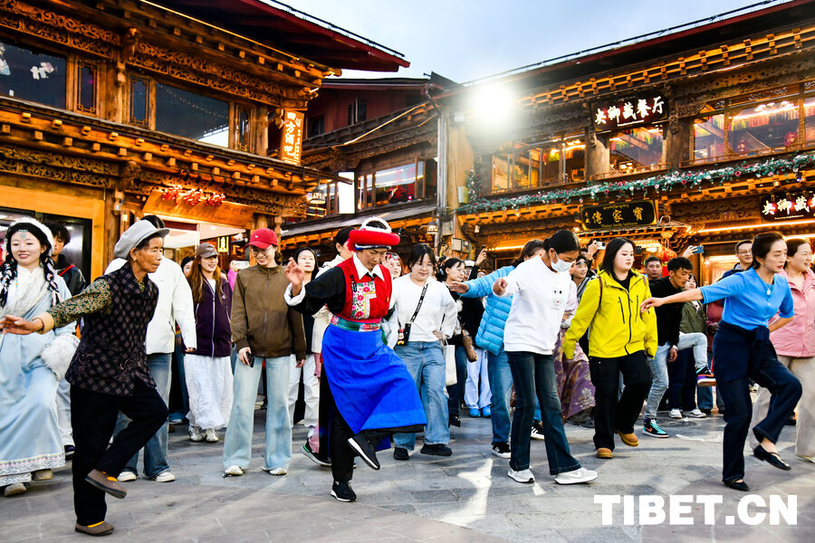 2025年8月16日,在云南省迪庆藏族自治州香格里拉市建塘镇独克宗古城龟山公园脚下古城内,各民族同胞一起跳起锅庄舞。摄影:赵振宇