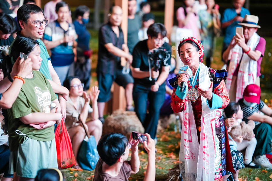除了中秋夜的专场盛会,双节期间,萨迦古城艺术团还带着非遗歌舞在徐汇多场快闪,让雪域声韵融入申城的烟火日常。在徐汇西岸梦中心船坞,傍晚时分,《吉祥索舞》《扎西岗谐热》的灵动舞姿如约而至,与黄浦江的江涛相映,让秋风里多了份雪域的鲜活;夜幕降临后,船坞北侧亲水平台响起《回到拉萨》的熟悉旋律,歌声伴着江涛与外滩的钟声遥相和鸣,成了双节里随处可见的“文旅共鸣”。