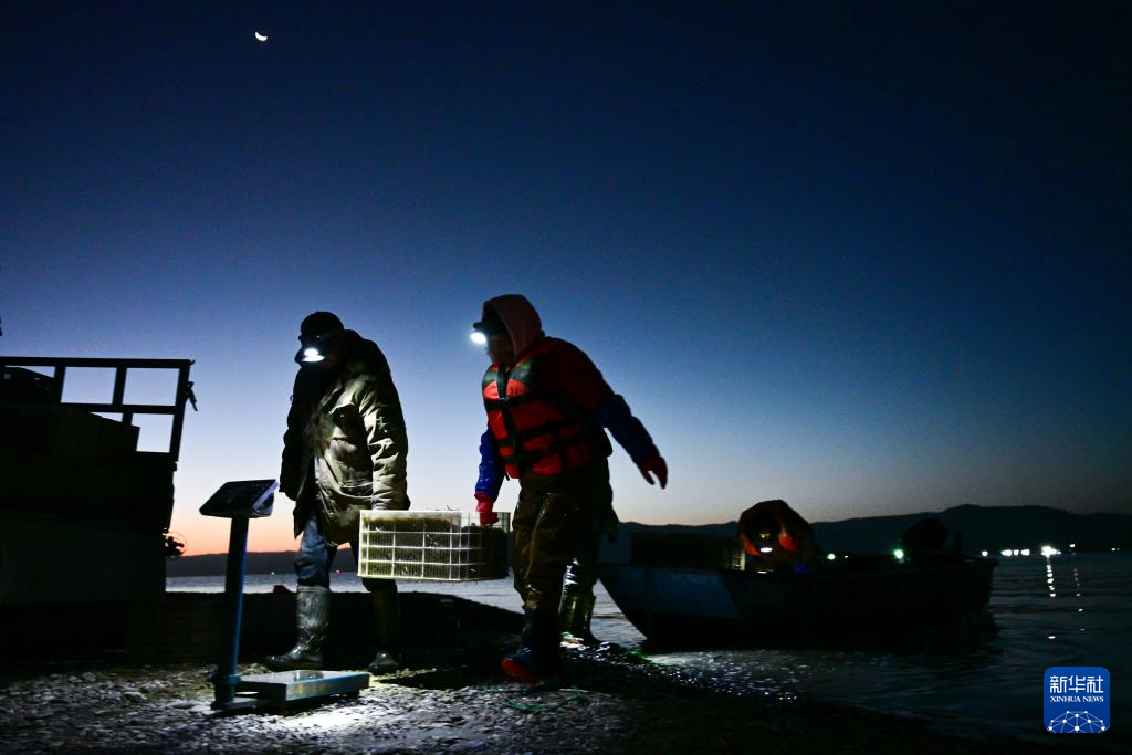 10月18日,库区渔民将一箱刚捕捞的小银鱼上秤称重。新华社记者 齐芷玥 摄