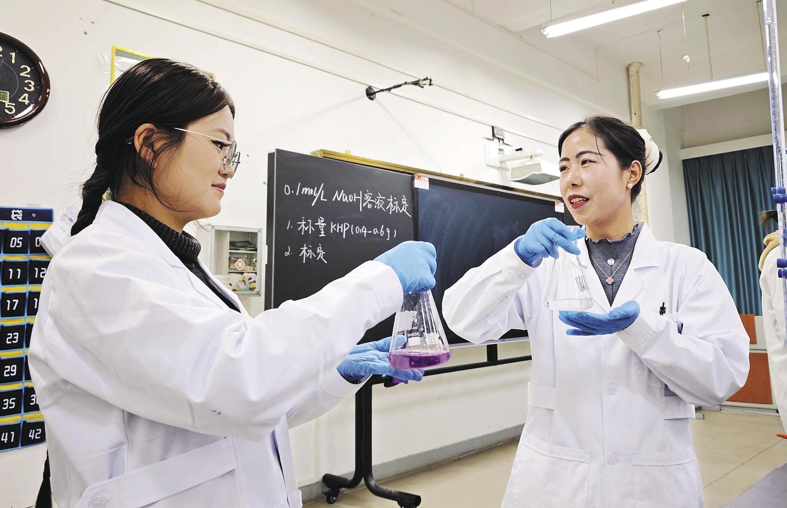 在老师带领下学习化学分析课程中的氢氧化钠标定内容。
