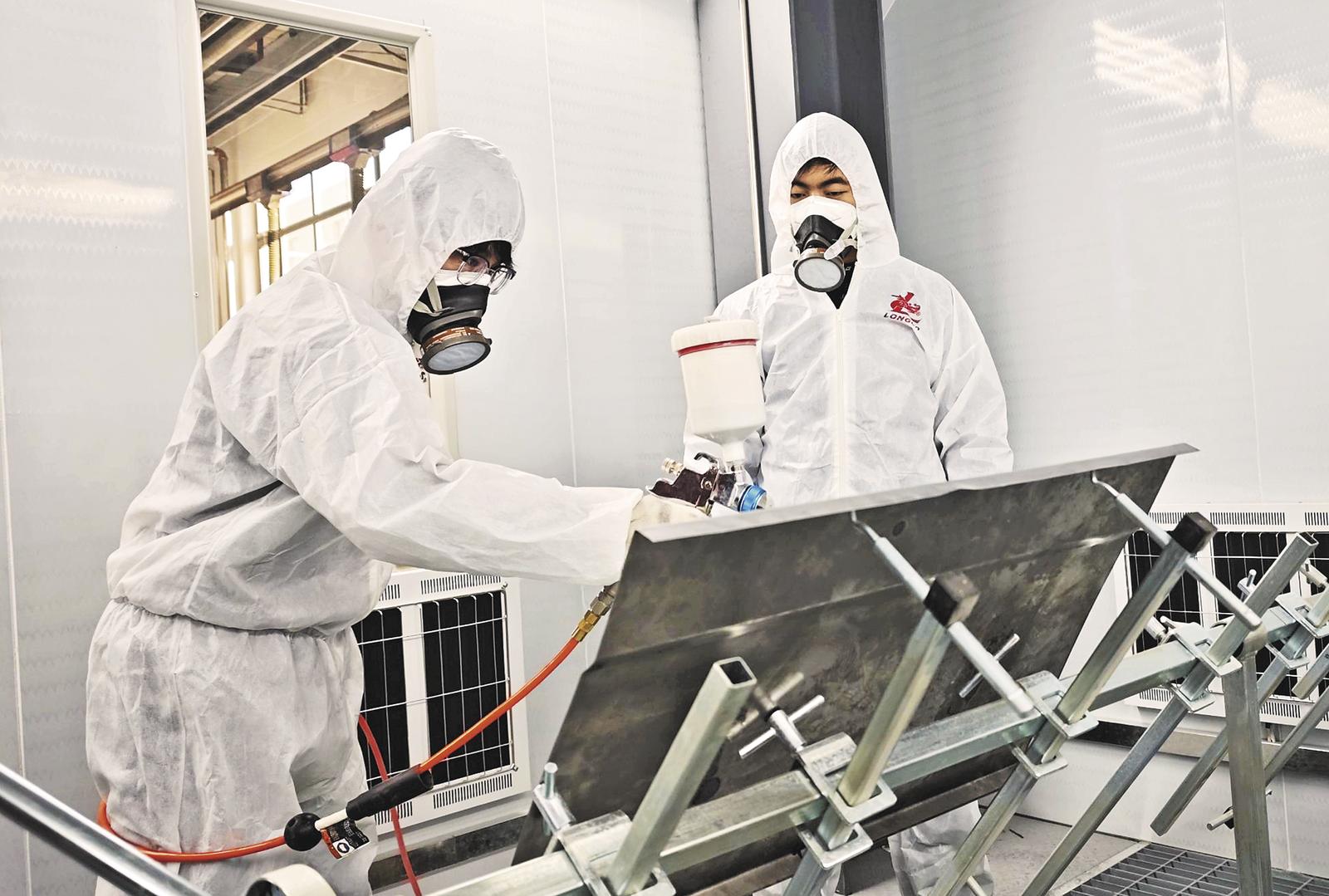 参加省级汽车装备制造技能大赛赛前训练的学生正在进行汽车涂装学习。