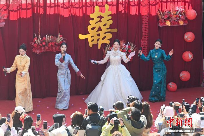 小型舞台上,司仪用普通话、藏语、云南方言讲述着新人的爱情故事。永宗与培楚换上西式礼服登台致谢。随后,舞台成为欢乐的海洋。永宗身着婚纱与3位女同事深情献唱,几位帅气藏族小伙组成“男团”,跳起热门网络舞蹈,引得现场尖叫连连。老一辈也不甘示弱,登台带来藏族民歌、弦子演奏等精彩节目,将婚礼变成“小型演唱会”。