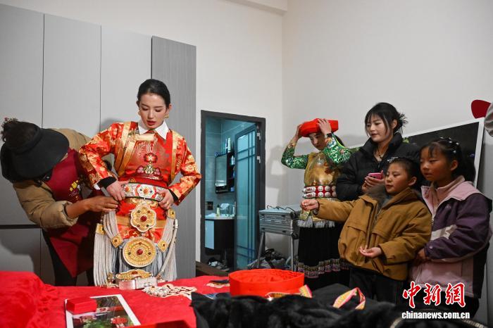 1月24日,婚礼迎来高潮。清晨,永宗早早开始梳妆打扮,在亲人的帮助下穿上传统藏装,佩戴嘎乌盒、腰带等配饰。配饰上的一颗颗红珊瑚,比金银装饰更加耀眼。“这些配饰是从我婆婆的婆婆传到我这一代的。”永宗介绍。