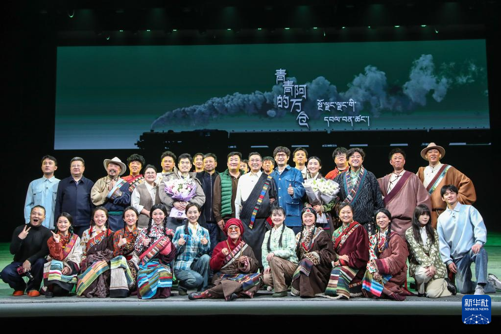 1月28日晚,在甘肃黄河剧院,演职人员在话剧《青青的阿万仓》演出结束后合影。新华社记者 郎兵兵 摄