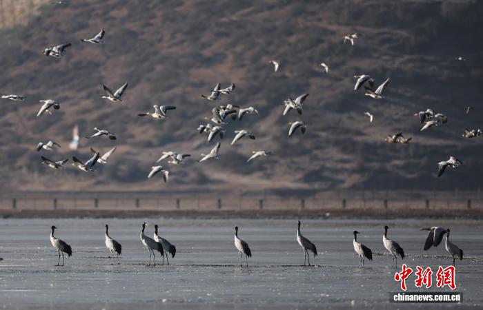 1月23日,黑颈鹤与斑头雁在纳帕海共舞。黄兴鸿 摄