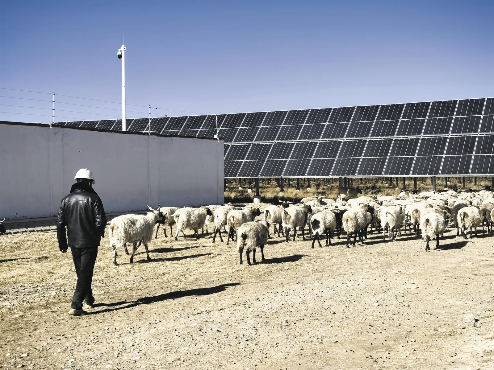 牧民索南才让家的羊群,在光伏板下觅食。