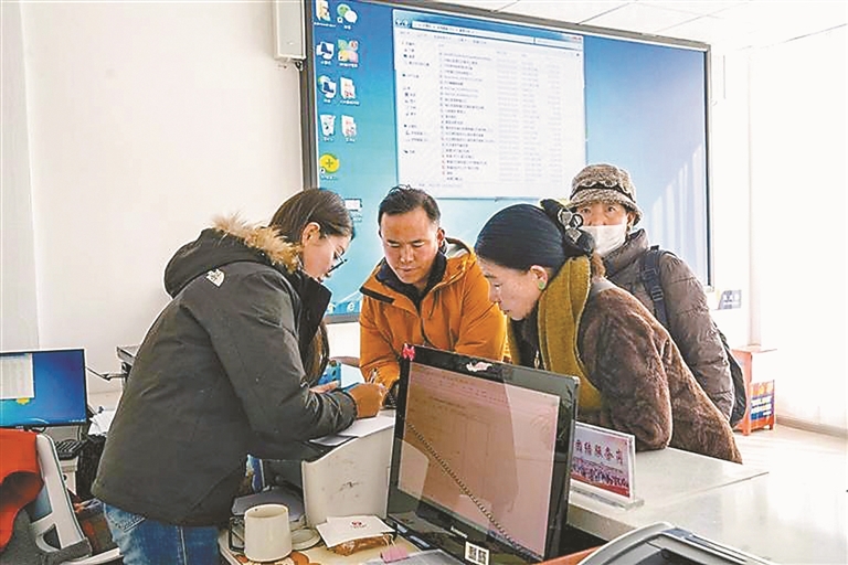 日喀则市桑珠孜区幸福社区工作人员在帮助居民交医保。记者 桑旦欧珠 摄