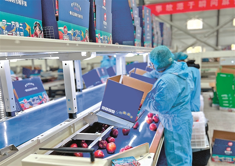 图为林芝盛世农业科技有限公司工人在包装苹果(资料图片)。