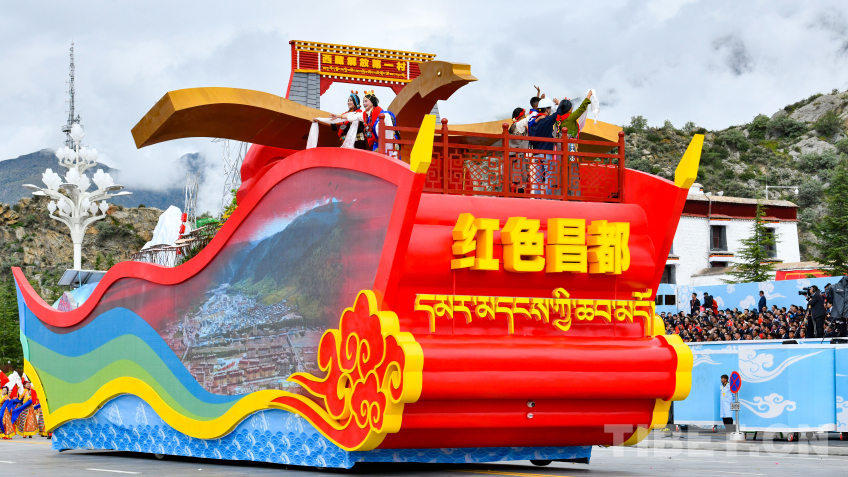 昌都市彩车,以“西藏第一面五星红旗升起的地方”“西藏解放第一村”为基调,红色印记格外醒目。“红色昌都”彩车,车体以红旗为主线勾勒轮廓,承载着雪域儿女对西藏60年辉煌成就的深情礼赞。