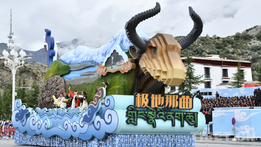 山南市彩车,以传统的牛皮筏为造型主体,融合雅鲁藏布江水系,总体造型为“前进中的方舟”,激荡着山南厚重的历史与活力。