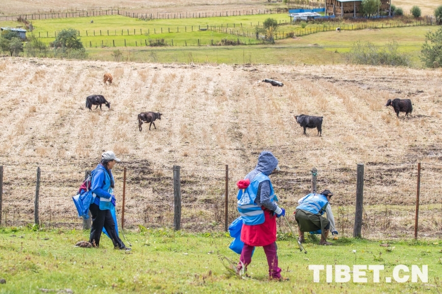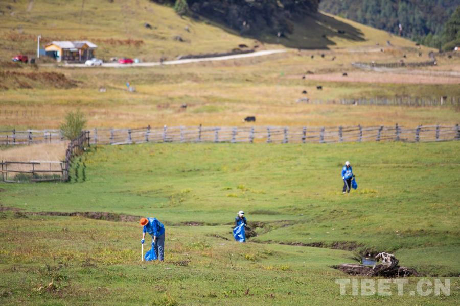 图为志愿者们在鲁朗小镇周边捡拾垃圾