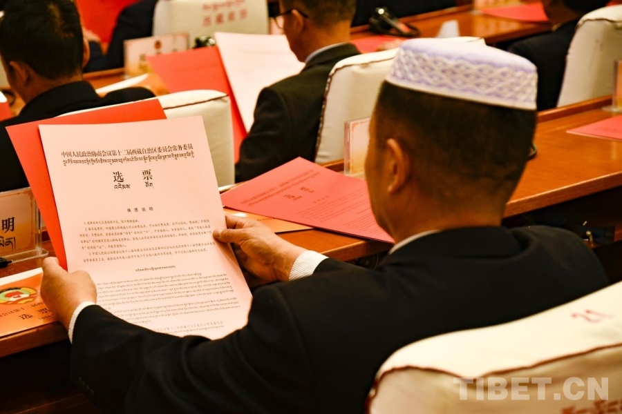 图为政协第十二届西藏自治区委员会第四次会议选举现场,政协委员认真阅读选票说明 摄影:赵振宇