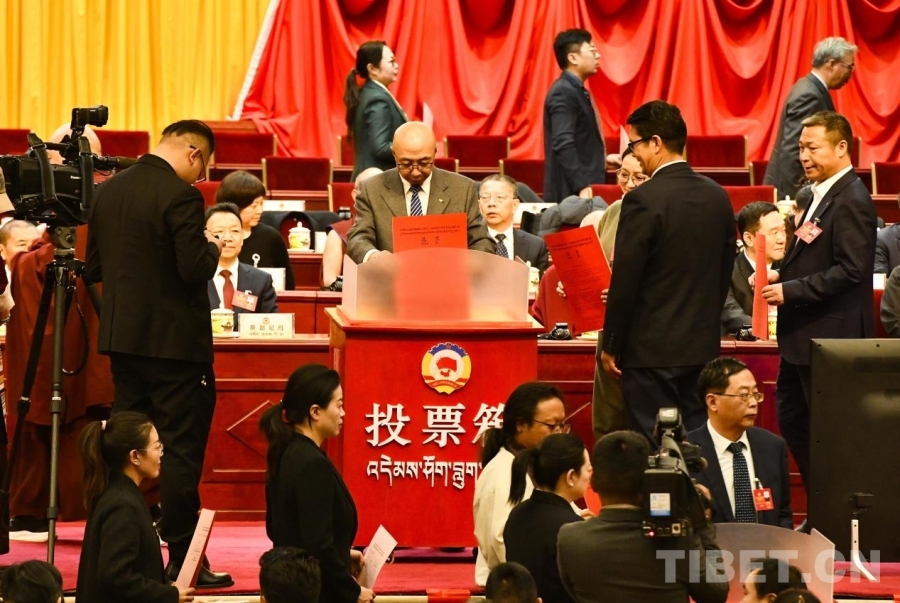 图为政协第十二届西藏自治区委员会第四次会议选举现场,政协委员在选举中投票 摄影:赵振宇