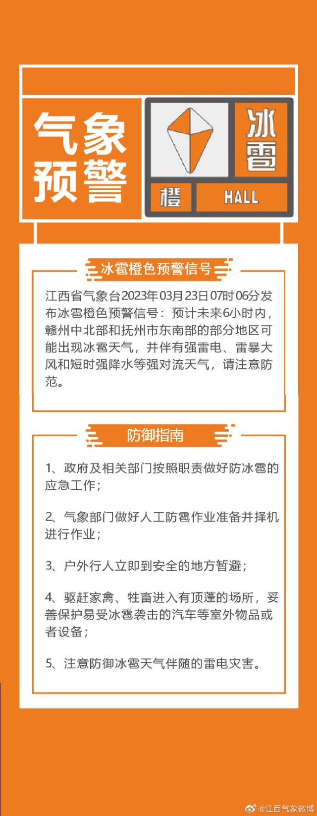 江西省气象台2023年03月23日07时06分发布冰雹橙色预警信号:预计未来6小时内,赣州中北部和抚州市东南部的部分地区可能出现冰雹天气,并伴有强雷电、雷暴大风和短时强降水等强对流天气,请注意防范。