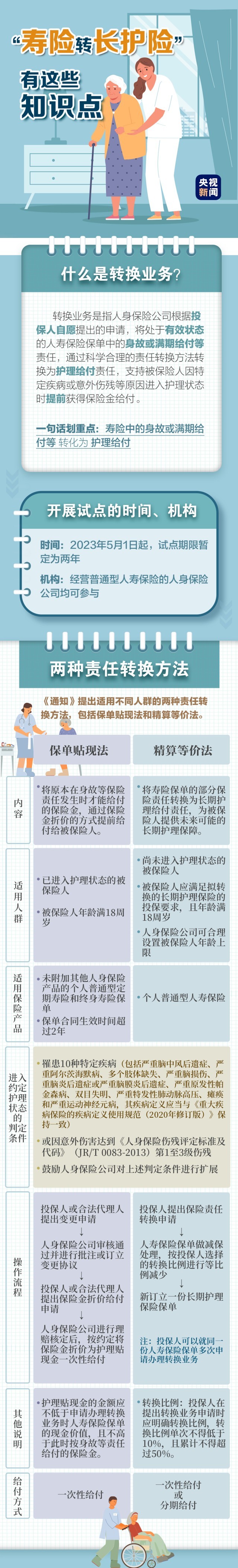 近日,中国银保监会印发《关于开展人寿保险与长期护理保险责任转换业务试点的通知》,决定自2023年5月1日起开展人寿保险与长期护理保险责任转换业务(以下简称“转换业务”)试点,试点期限暂定两年。