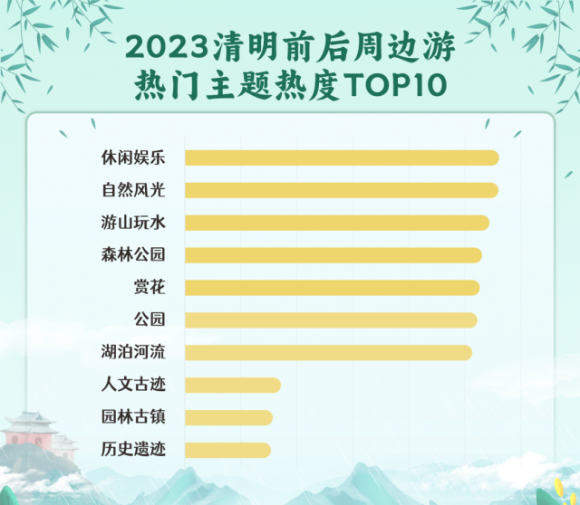 据某旅游票务平台发布的《2023清明假期出游趋势报告》,清明期间,本地及周边短途出游是主流,出游主题上具有显著的春游季特征。《报告》显示,清明假期(4月5日)前后周边游的热门主题按照热度排序依次为休闲娱乐、自然风光、游山玩水、森林公园、赏花、公园等。前十个热门主题中,具有赏花踏青属性的主题占据了六席。