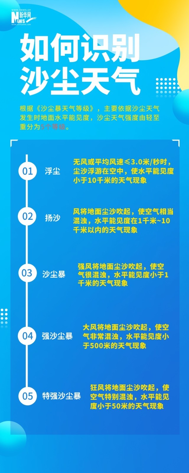 沙尘天气是指风将地面尘土、沙粒卷入空中,使空气混浊的天气现象。根据《沙尘暴天气等级》,主要依据沙尘天气发生时地面水平能见度,沙尘天气强度由轻至重分为5个等级。