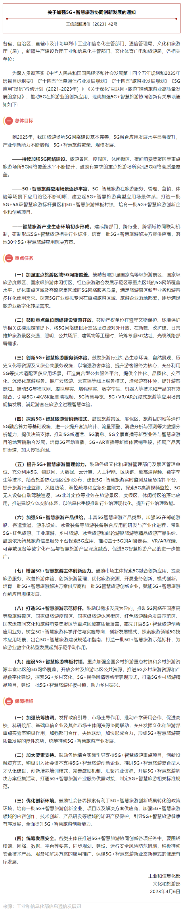 据“工信微报”公众号消息,为深入推进5G在旅游业的创新应用,赋能旅游业数字化、网络化、智能化转型升级,培育发展智慧旅游新业态、新模式,推动5G智慧旅游协同创新发展,工业和信息化部联合文化和旅游部印发《关于加强5G+智慧旅游协同创新发展的通知》。