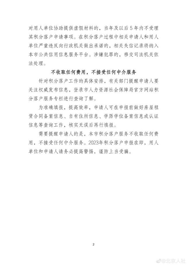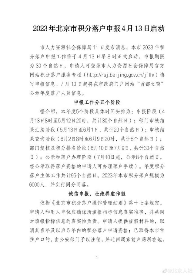 央视网消息:据@北京人社 微博消息,2023年北京市积分落户申报工作将于4月13日早8时正式启动。