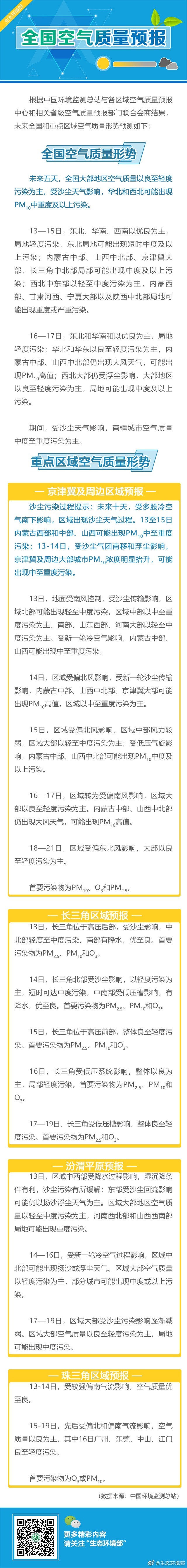 央视网消息:据@生态环境部 微博消息,未来五天(4月13—17日),全国大部地区空气质量以良至轻度污染为主,受沙尘天气影响,华北和西北可能出现PM10中重度及以上污染。
