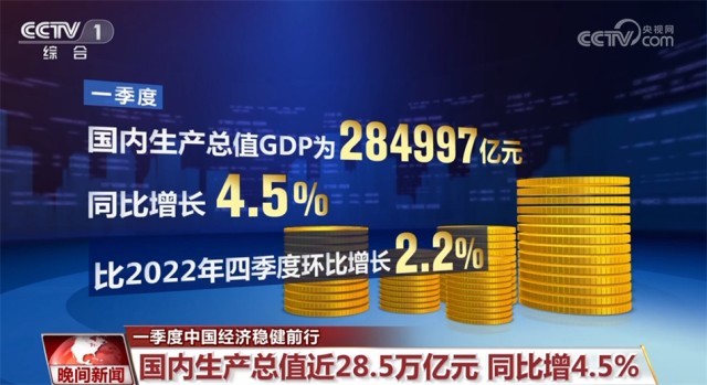 一季度,国内生产总值(GDP)为284997亿元,同比增长4.5%,比2022年四季度环比增长2.2%。在疫情防控取得重大决定性胜利后,中国经济逐步回升走稳,再次彰显出大国经济的韧性与活力。