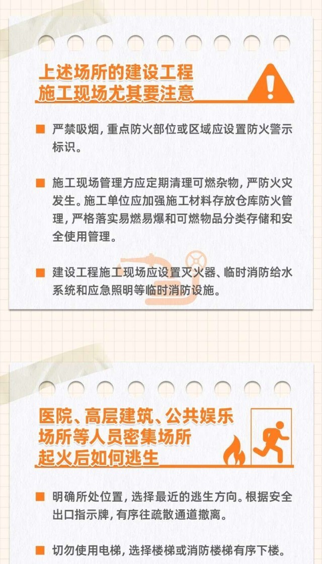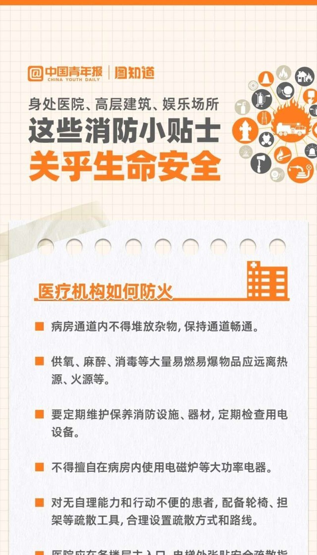当你走进KTV、高层写字楼、医院等人员密集场所时,是否留心观察过消防通道的位置?日常经过的住宅楼道内是否张贴了消防要求?生命安全无小事,着眼细处才能防患于未“燃”。这里有一份火灾高风险区域场所的消防小贴士,请查收~