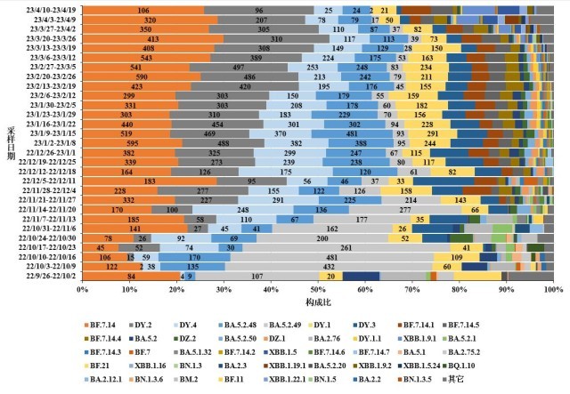 2.图中标记的数字按顺序分别为BF.7.14、DY.2、DY.4、BA.5.2.48、BA.5.2.49和DY.1进化分支有效基因组序列数量;