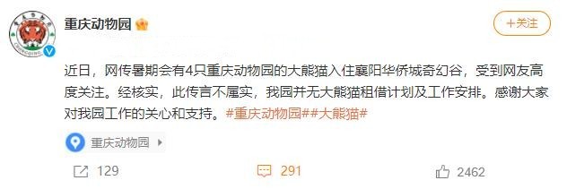 4只大熊猫将入住襄阳一娱乐园?重庆动物园:不属实 无大熊猫租借计划