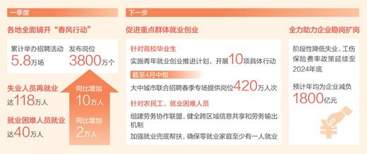 保重点,促进重点群体就业创业。针对高校毕业生,将实施促进高校毕业生等青年就业创业推进计划,开展10项具体行动,着力拓展就业渠道、做实做细就业服务、强化困难兜底保障。截至4月中旬,大中城市联合招聘春季专场提供岗位420万人次。针对农民工、就业困难人员,将组建劳务协作联盟,健全跨区域信息共享和劳务输出机制。加强困难群体就业兜底帮扶,确保零就业家庭至少有一人就业。