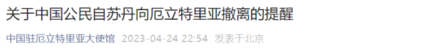 4月24日晚间,我国驻埃及使馆发布关于中国公民自苏丹向埃及撤离的提醒: