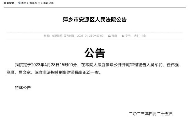 记者今天(25日)获悉,备受关注的江西南昌豫章书院非法拘禁刑事附带民事诉讼一案将于4月28日15时在江西省萍乡市安源区人民法院继续开庭审理。