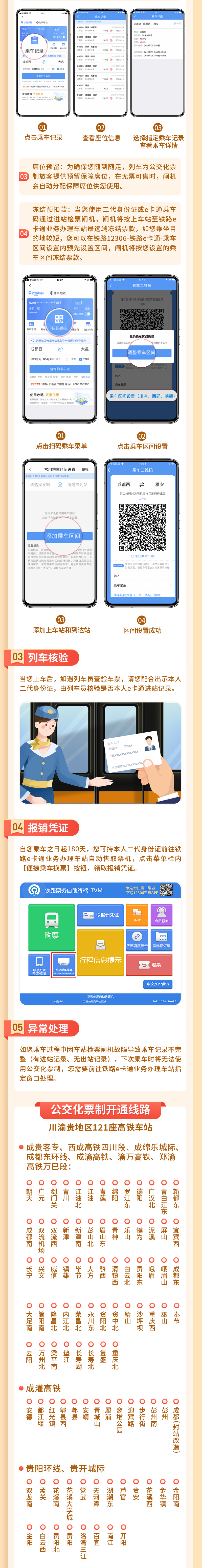 为进一步提升通勤旅客出行体验,中国铁路成都局集团有限公司管内的川渝贵地区121座高铁车站启用公交化票制。已开通铁路e卡通的旅客在铁路12306客户端-铁路e卡通主页,启用刷证模式,即可使用二代身份证或e卡通乘车码,实现无需购票,刷证或扫码即走。