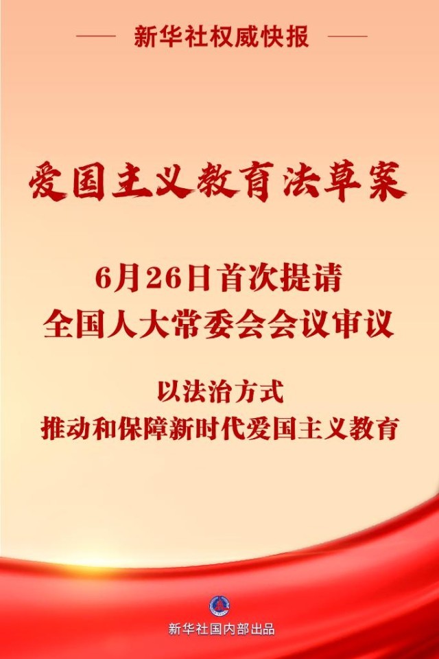 爱国主义教育法草案6月26日首次提请全国人大常委会会议审议。制定爱国主义教育法,以法治方式推动和保障新时代爱国主义教育,对于振奋民族精神、凝聚人民力量,推进强国建设、民族复兴,具有十分重大而深远的意义。