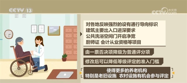 此次发布的指南包括环境、设施设备、运营管理、服务等多项内容,与2020年发布的《<养老机构等级划分与评定>国家标准实施指南》(试行)相比,在框架、体例整体保持一致的前提下,删除了一些可操作性不强以及非养老机构必备的条件,对各地反映强烈的设有通行导向标识、建筑主要出入口进深要求、公共洗浴空间门开启净宽、厨师证、会计从业资格等项目,由一票否决项降级为普通评分项,修改后可以降低等级评定的准入门槛,使得更多的养老机构特别是老旧设施、农村设施有机会参与评定。
