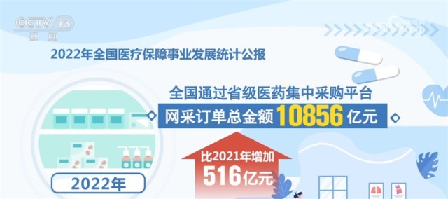 在药品和耗材集采方面,2022年,第七批国家组织药品集中带量采购涉及61个品种,平均降价48%。国家组织骨科脊柱类高值医用耗材集采纳入5种脊柱类骨科耗材,平均降幅84%。根据公报,2022年,全国通过省级医药集中采购平台网采订单总金额10856亿元,比2021年增加516亿元。其中,西药(化学药及生物制品)8810亿元,中成药2046亿元,分别比2021年增加495亿元和21亿元。群众用上了更多质优价宜的药品和耗材。
