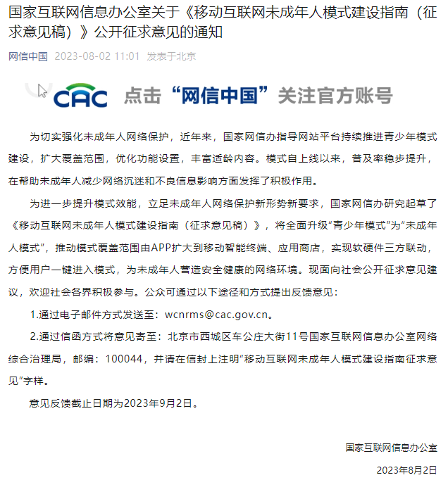 国家互联网信息办公室关于《移动互联网未成年人模式建设指南(征求意见稿)》公开征求意见的通知