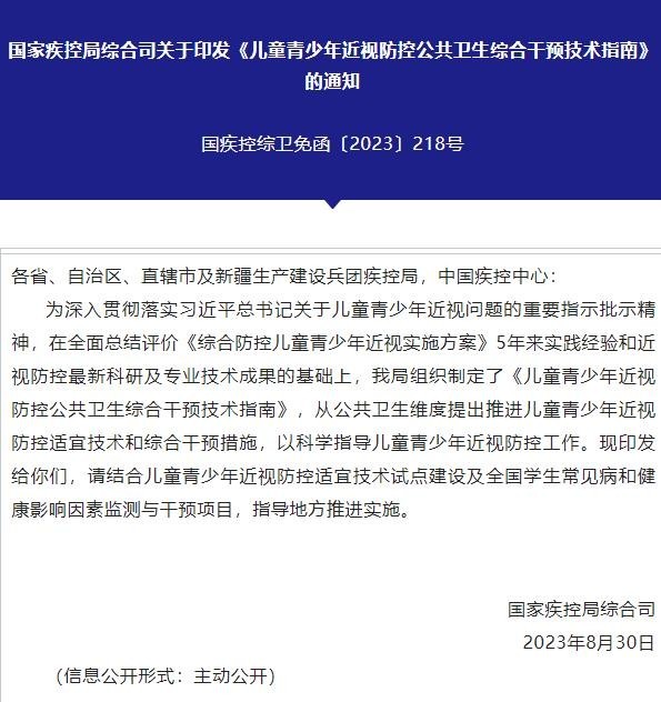 国家疾控局印发《儿童青少年近视防控公共卫生综合干预技术指南》