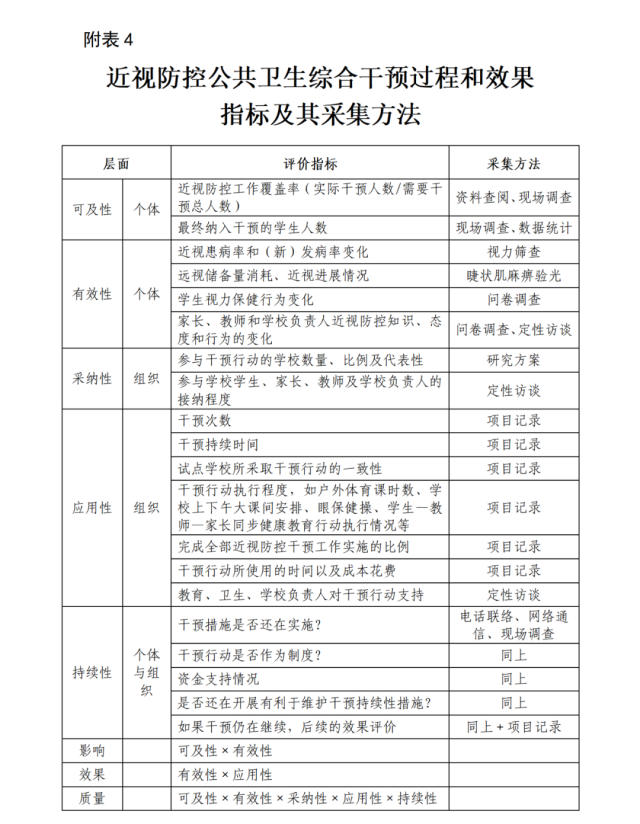 2.注重过程与效果评价。各级疾控机构要定期开展学生视力监测工作,深入分析历年监测数据,将监测发现的主要学生健康问题和建议及时报告当地政府。基于实施性研究方法,从理论向实践进行转化和应用,可推进干预行动的实施与传播。进行过程与效果评价,引入实施性研究框架和理论模型,如近视防控公共卫生综合干预过程和效果指标及其采集方法(附表4),从个体层面和组织层面全面评价干预行动的可及性、有效性、应用性、可持续性,系统性地评估儿童青少年近视公共卫生综合干预的实施成效。