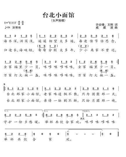 图为两岸主题歌曲《台北小面馆》曲谱。福建省音乐家协会供图